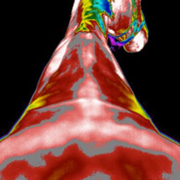 The infrared images above show before use of the pulsed magnetic therapy blanket. The image on the right show the horse after use of the blanket. Note the intense change to the muscles.